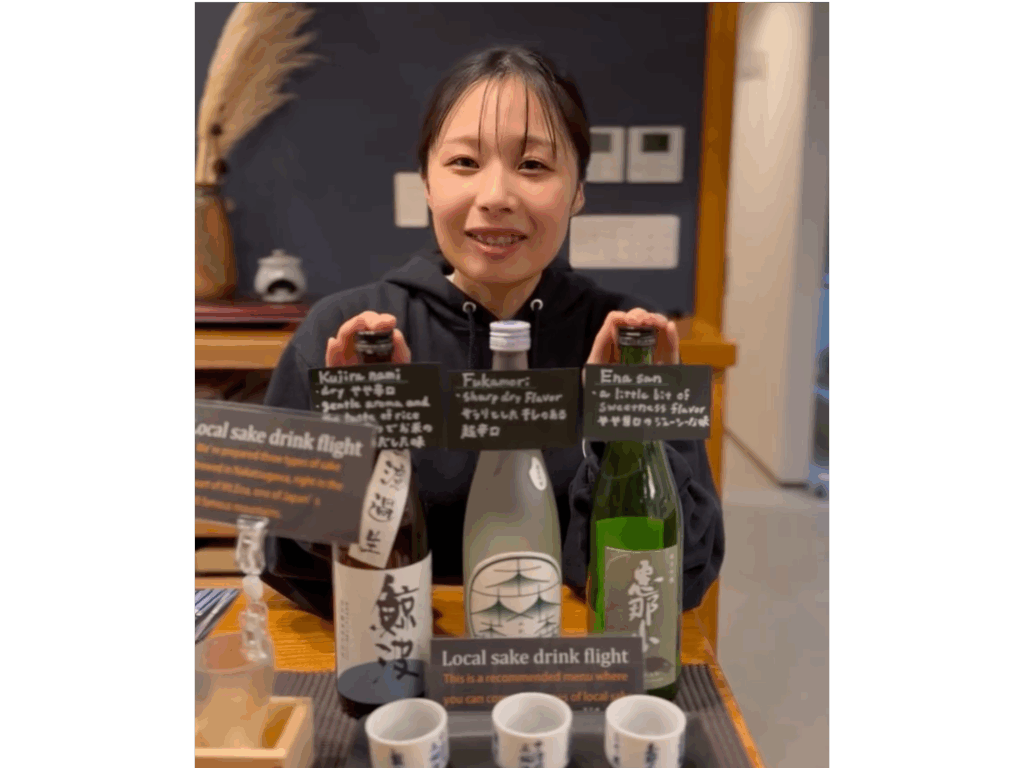 At our first-floor café & bar, we offer a carefully selected variety of local sakes. Guests can enjoy premium brands lovingly crafted by local Nakatsugawa breweries in a relaxed atmosphere.