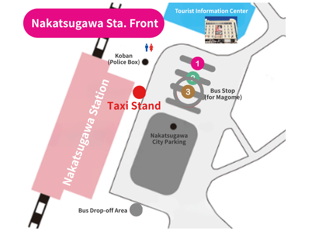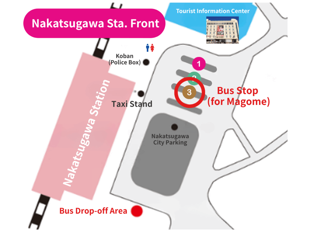 Bus Information: • Operator: Kitaena Kotsu • Route: Magome Line (Nakatsugawa Station → Nakagie → Magome) • Departure point: Platform 3 at Nakatsugawa Station (turn left after exiting the station, in front of Nigiwai Plaza) • Journey time: Approximately 25 minutes • Fare: ¥800 (as of March 2025 revision, fares subject to change)