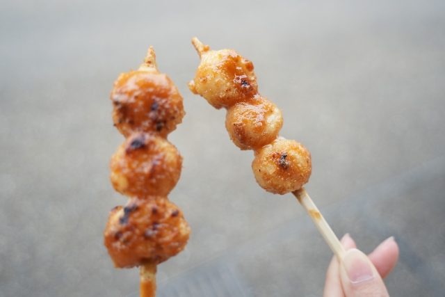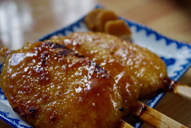 Gohei-mochi — grilled rice skewers coated in savory-sweet miso sauce.